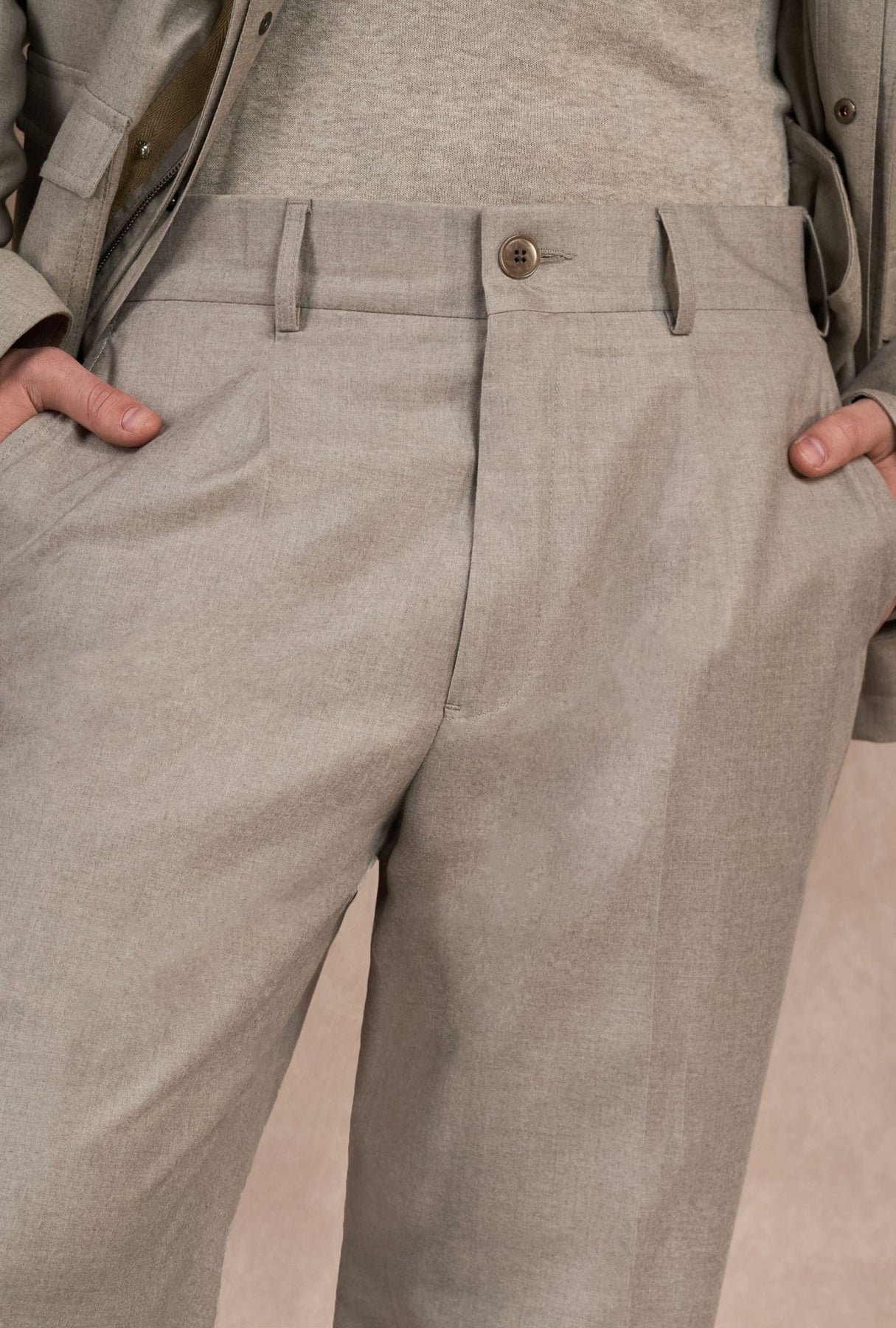 Pantalón color arena confeccionado en una mezcla premium que combina la presencia de la lana con la suavidad del cashmere, logrando un acabado limpio y sofisticado pensado para un look elegante y atemporal.