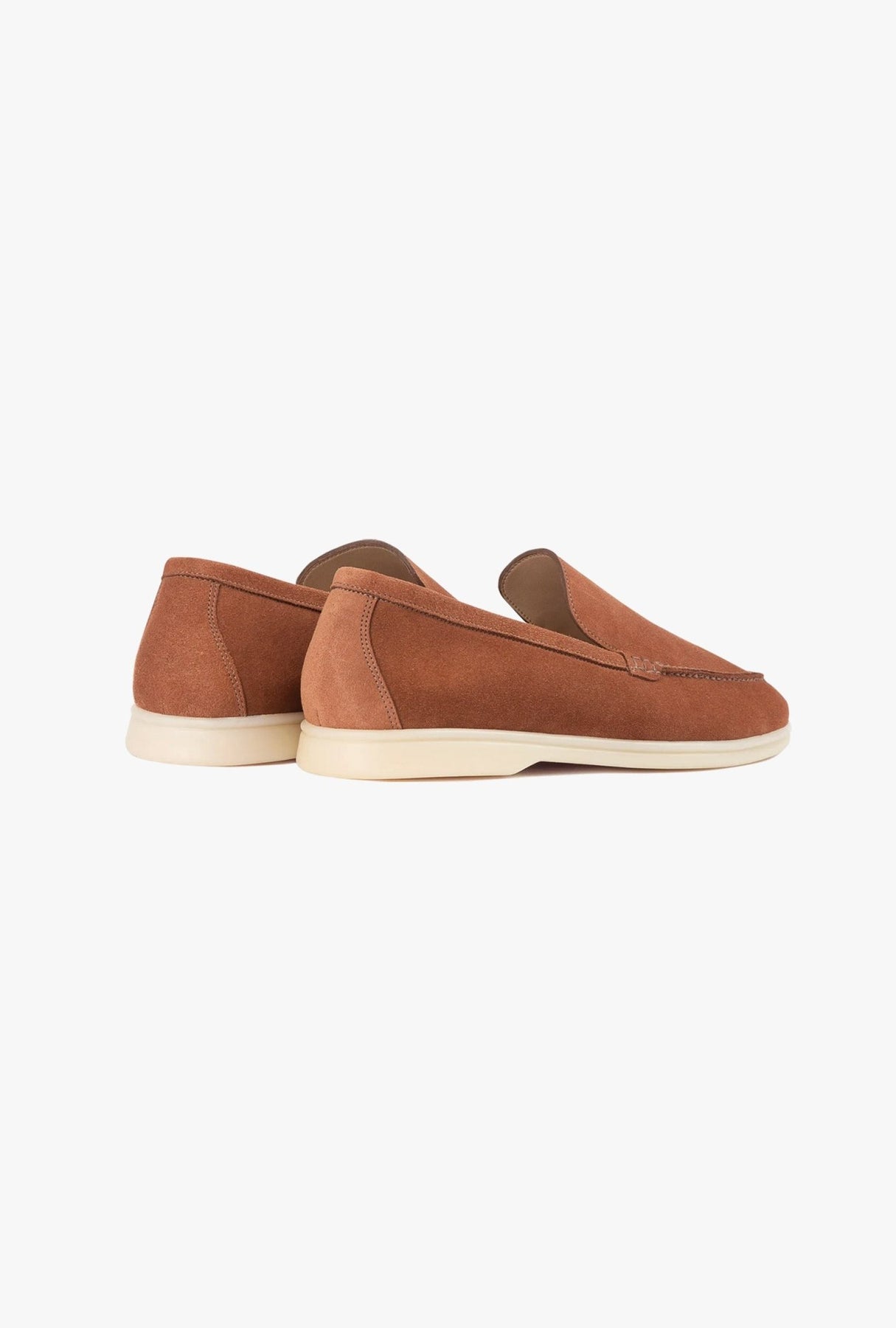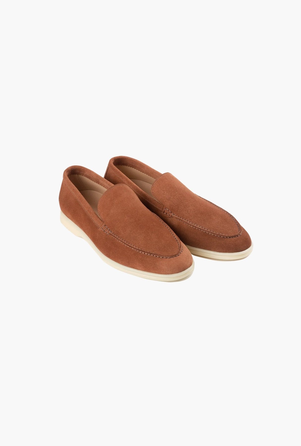 Mocasines de gamuza de becerro hechos completamente a mano en Montegranaro, Italia. Se caracterizan por un acabado aterciopelado único. Su diseño ligero y suave proporciona una comodidad inigualable gracias a su construcción precisa y suelas de goma. Además, la gamuza de becerro garantiza una durabilidad superior a la de cualquier otro tipo de gamuza.